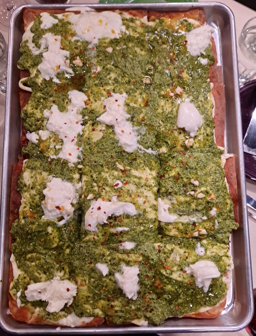 With ricotta, mozzarella, pesto artichoke cream, burrata, agave, garlic and hot pepper oil, the Burrata Queen is a Sicilian pie unlike any other. Photo: Joe Bonadio