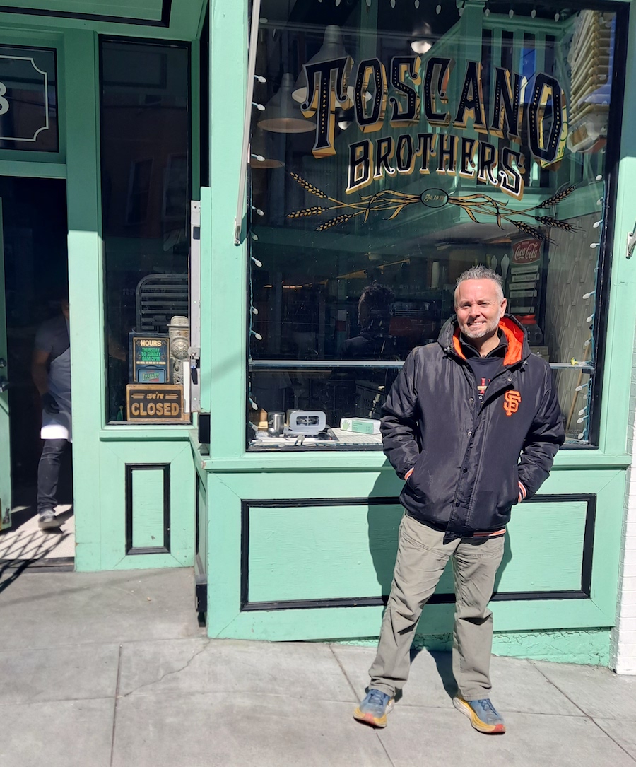 TonyatToscanoBros Published March 16, 2023 at 900 × 1085 in Tony Gemignani Dishes On His Flagship, Franchising—and Opening In LA Next → Tony Gemignani in front of his Toscano Brothers Bakery/Dago Bagel. | Photo: Joe Bonadio